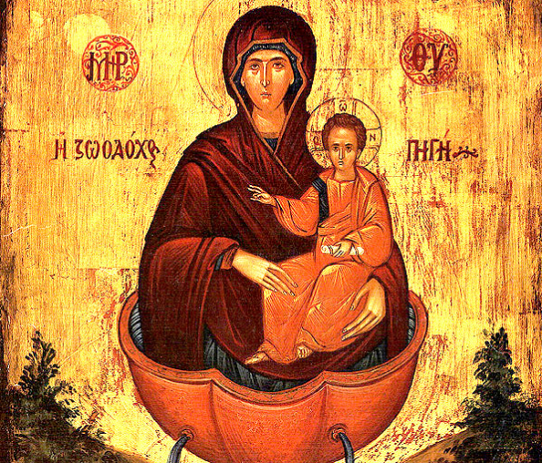 Σήμερα, Παρασκευή της Διακαινησίμου, δεσπόζει η εορτή της Ζωοδόχου Πηγής. Εορτάζει η Εκκλησία μας τα εγκαίνια του ναού της υπεραγίας Δεσποίνης ημών Θεοτόκου της Ζωοδόχου Πηγής και τελείται πανήγυρις προς τιμήν της Θεοτόκου.