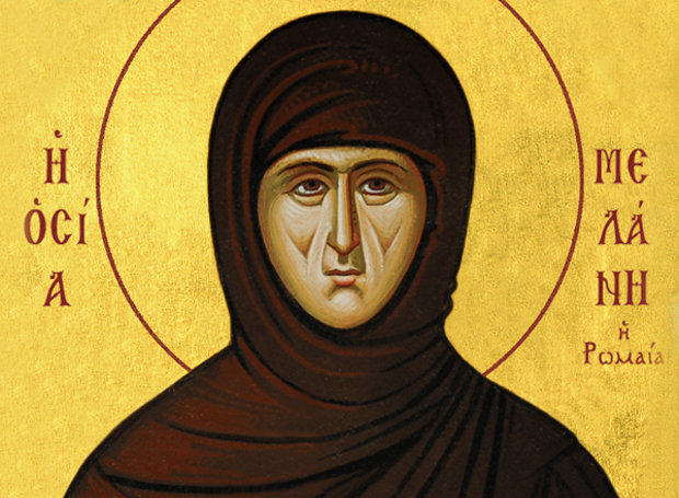 Η Αγία Μελάνη γεννήθηκε στη Ρώμη το 338 μ.Χ. Οι γονείς της ήταν εύποροι και επιφανείς. Ωστόσο ήταν ευσεβείς και πορεύονταν εν Χριστώ. Η Αγία από νεαρή ηλικία δεν επιθυμούσε το γάμο, αλλά οι γονείς της, που επιθυμούσαν να αποκτήσουν διάδοχο, την πάντρεψαν στην ηλικία των δεκατεσσάρων ετών με το δεκαεπτάχρονο Απελλιανό, γόνο επιφανούς οικογένειας.