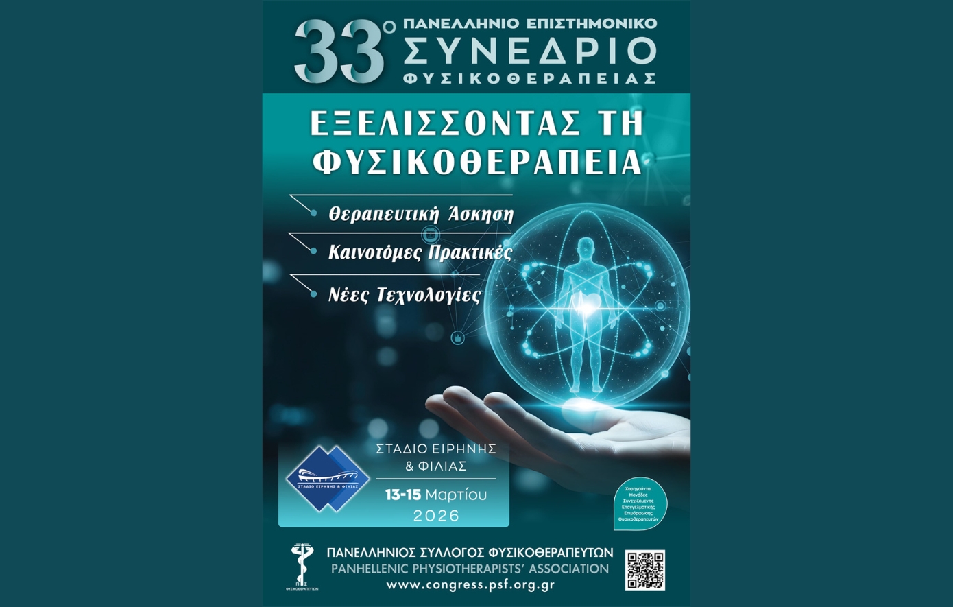 Ο Πανελλήνιος Σύλλογος Φυσικοθεραπευτών ανακοινώνει τη διοργάνωση του 33ου Πανελληνίου Επιστημονικού Συνεδρίου Φυσικοθεραπείας, του κορυφαίου επιστημονικού γεγονότος για τον κλάδο, που θα πραγματοποιηθεί από τις 13 έως τις 15 Μαρτίου 2026 στην Αθήνα, στο Στάδιο Ειρήνης και Φιλίας.
