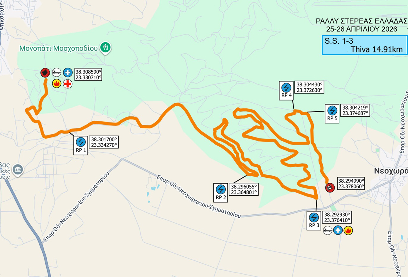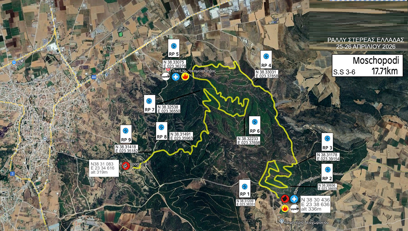 Το πρώτο αγωνιστικό αυτοκίνητο θα αναχωρήσει στις 09:30 από το «Πελοπίδειο» για την πρώτη Ειδική Διαδρομή του αγώνα, «Θήβα», μήκους 14,91 χλμ. ακολουθεί η Ειδική Νεοχωράκι», μήκους 13,62 χλμ, στις 10:26, και το πρώτο loop ειδικών ολοκληρώνεται με την Ειδική «Μοσχοπόδι», μήκους 17,71 χλμ, στις 11:09.