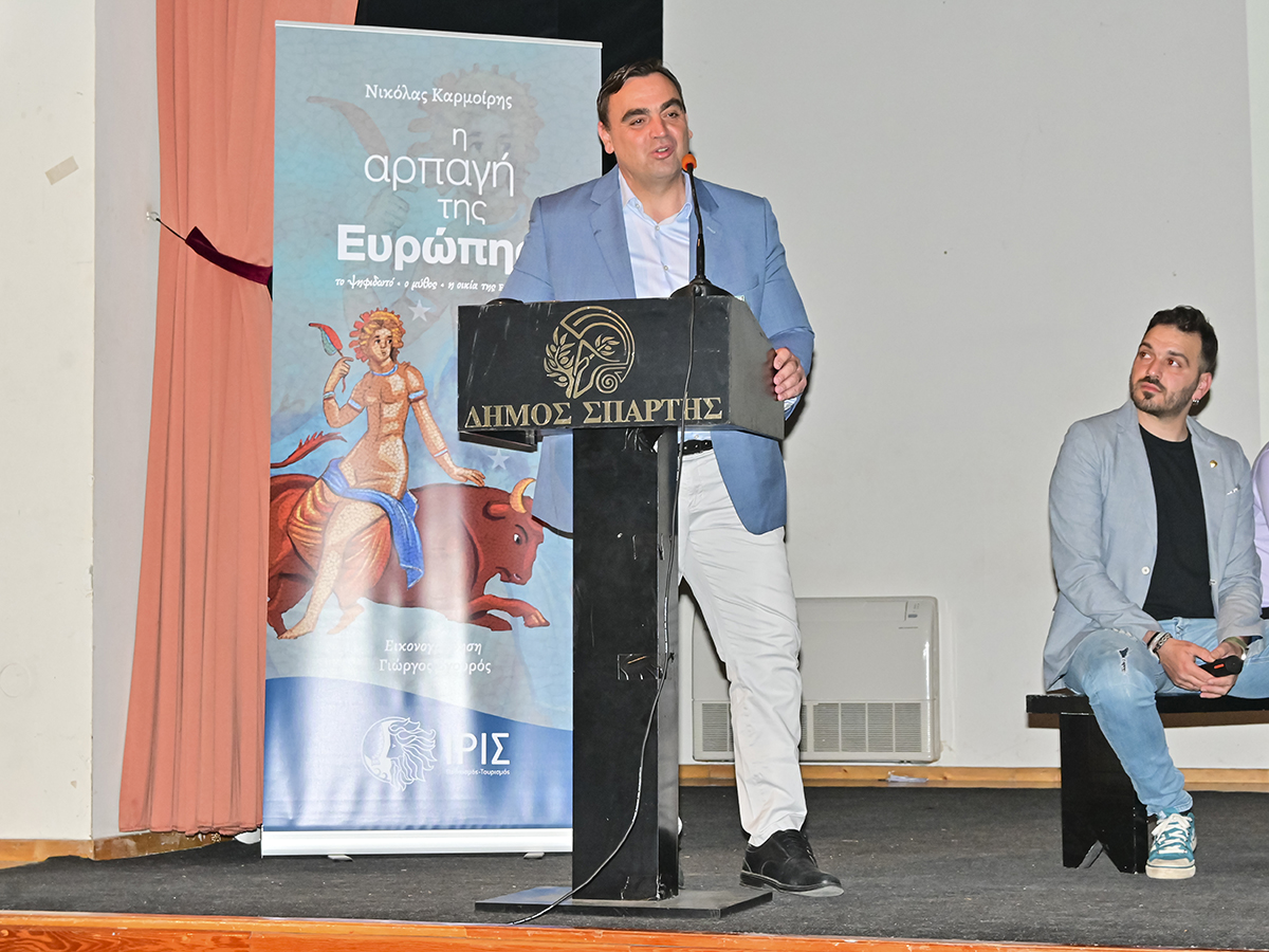 Σε μια ζεστή και συγκινητική ατμόσφαιρα, πραγματοποιήθηκε το απόγευμα του Σαββάτου 10 Μαΐου 2025, στο Πνευματικό Κέντρο του Δήμου Σπάρτης, η πρώτη παρουσίαση του παιδικού-εφηβικού εικονογραφημένου βιβλίου με τίτλο: «Η αρπαγή της Ευρώπης: το ψηφιδωτό · ο μύθος · η οικία της Ευρώπης», που κυκλοφόρησε πρόσφατα από την Εταιρεία για τον Πολιτισμό και τον Τουρισμό «ΙΡΙΣ», με αφορμή την Ημέρα της Ευρώπης (9 Μαΐου).