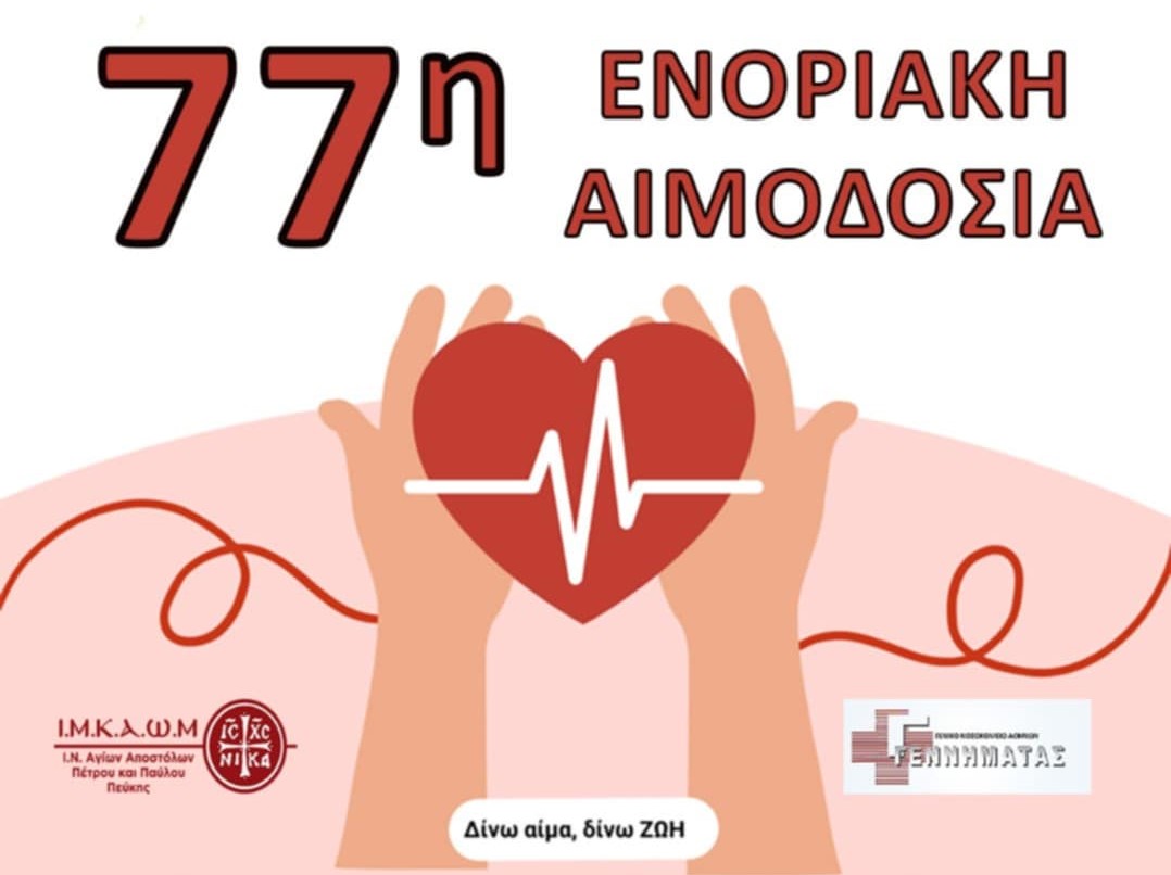 Το Σάββατο 15 και την Κυριακή 16 Νοεμβρίου 2025 διοργανώνεται η 77η Ενοριακή Αιμοδοσία, η οποία θα λάβει χώρα στο Πνευματικό Κέντρο του Ι.Ν. των Αγίων Αποστόλων Πέτρου και Παύλου Πεύκης.