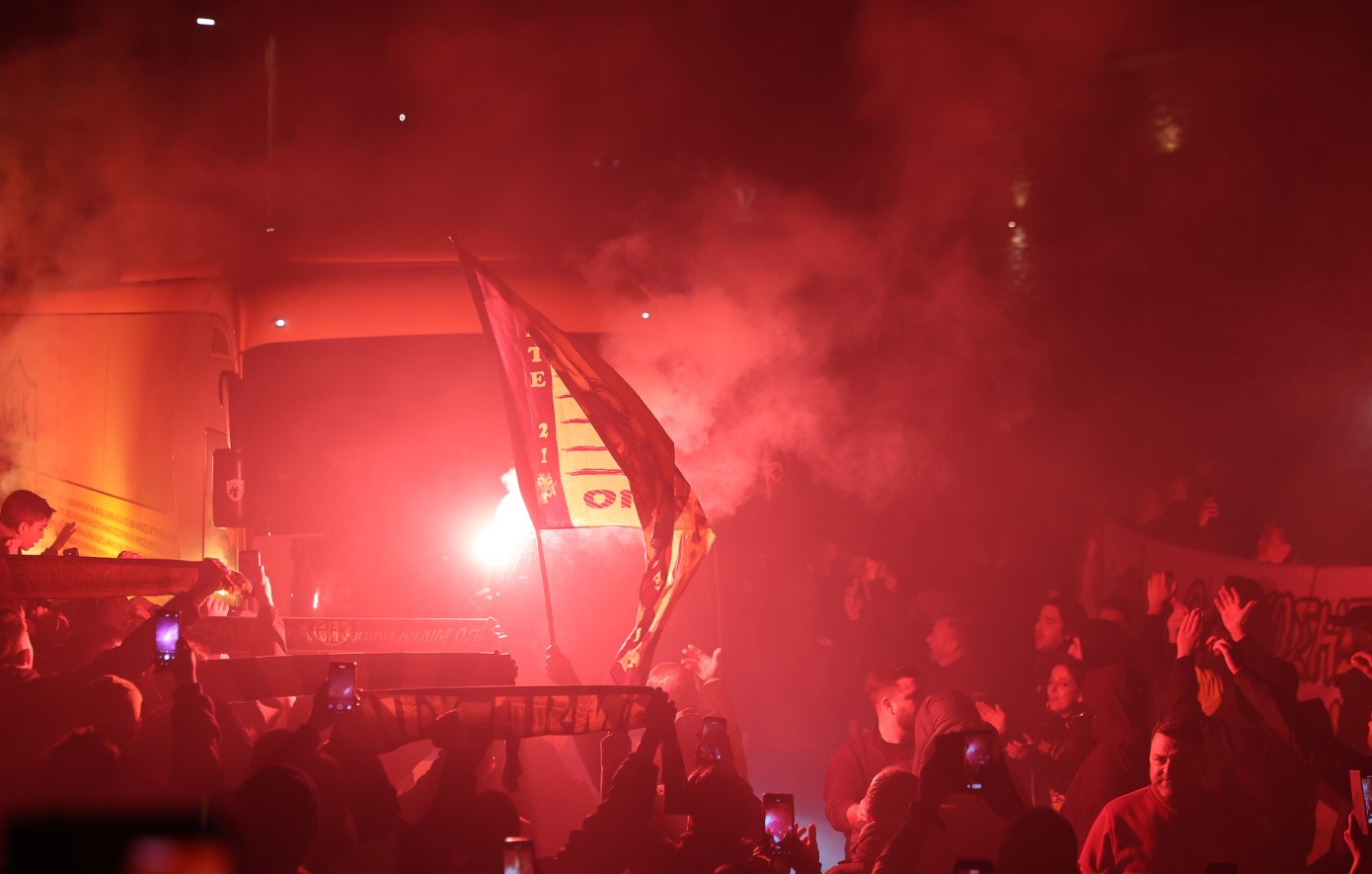 Με καπνογόνα, συνθήματα και σημαίες, οι οπαδοί της ΑΕΚ δημιούργησαν ατμόσφαιρα γηπέδου και περιμένουν πώς και πώς την έναρξη του αγώνα την Κυριακή (1/3), περιμένοντας τη νίκη με την οποία η ομάδα του Νίκολιτς θα παραμείνει στην κορυφή της βαθμολογίας.