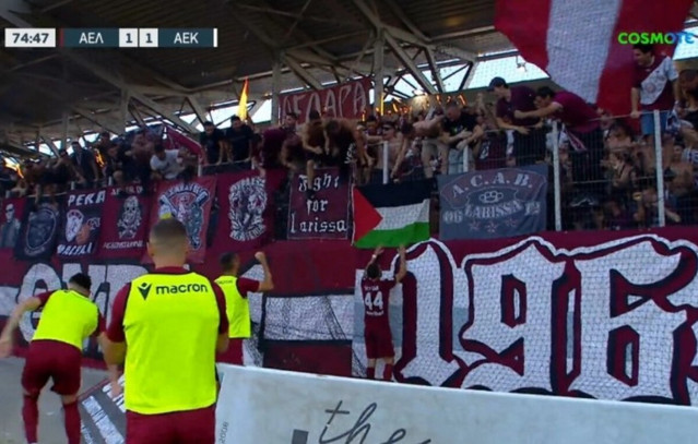 Ο Σοφιάν Τσάκλα έβαλε το γκολ της ΑΕΛ στο 1-1 με την ΑΕΚ και το πανηγύρισε με φιλιά προς μια σημαία της Παλαιστίνης που είχαν κρεμάσει οι οπαδοί στο πέταλο.