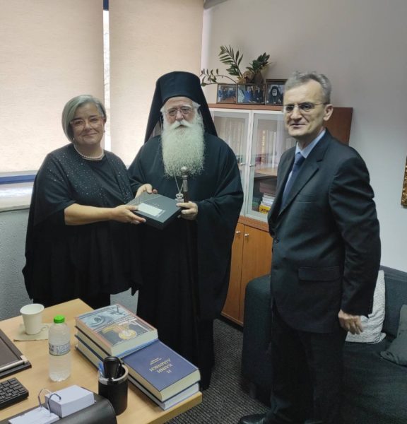 Μετά το πέρας της τελετής, τον Σεβασμιώτατο δέχθηκε στο γραφείο του ο Αναπληρωτής Καθηγητής του Τμήματος κ. Σωτήριος Μπαλατσούκας, με τον οποίο είχε εγκάρδια συνομιλία.