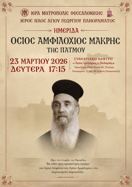 Από την Ιερά Μητρόπολη Θεσσαλονίκης ανακοινώνεται, η πραγματοποίηση μιας ιδιαιτέρως ενδιαφέρουσας εκδηλώσεως. Συγκεκριμένα, την προσεχή Δευτέρα, 23 Μαρτίου 2026 στο Αμφιθέατρο του Εκπαιδευτικού και Πολιτιστικού Ιδρύματος της Ιεράς Μητροπόλεως Θεσσαλονίκης «Άγιος Γρηγόριος ο Παλαμάς» (Νικολάου Πλαστήρα 65 – περιοχή Χαριλάου), θα πραγματοποιηθεί, με την ευλογία του Μητροπολίτου Θεσσαλονίκης κ. Φιλοθέου, από τον ενοριακό Ιερό Ναό του Αγίου Γεωργίου Πανοράματος σε συνεργασία με νέους και νέες, φοιτήτριες και φοιτητές της Θεολογικής Σχολής και άλλων Σχολών του Α.Π.Θ. αγιολογική Ημερίδα, αφιερωμένη στον Όσιο Αμφιλόχιο Μακρή.