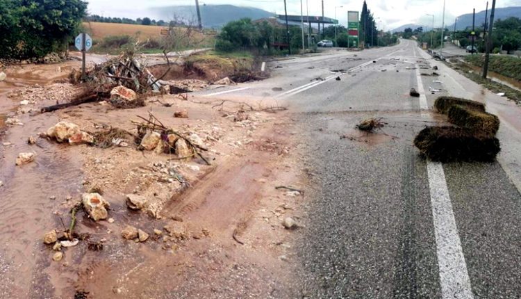 Η βροχόπτωση είναι γενικά έντονη. Οι λάσπες έχουν γεμίσει την Εθνική Οδό και συνεργεία καθαρίζουν το οδόστρωμα από τα φερτά υλικά.