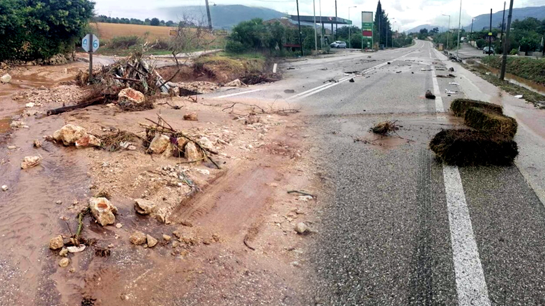 Η βροχόπτωση είναι γενικά έντονη. Οι λάσπες έχουν γεμίσει την Εθνική Οδό και συνεργεία καθαρίζουν το οδόστρωμα από τα φερτά υλικά.