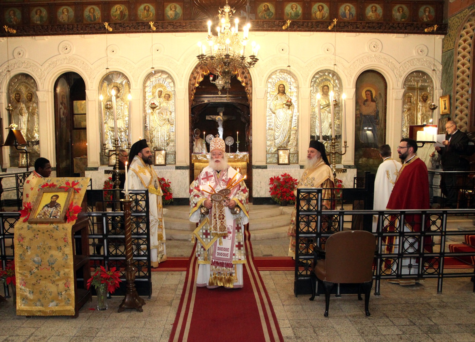 Εκ μέρους του κλήρου και του ποιμνίου, τις εόρτιες ευχές υπέβαλε ο Θεοφιλέστατος Επίσκοπος Μαρεώτιδος κ. Δαμασκηνός, Πατριαρχικός Επίτροπος Αλεξανδρείας, εκφράζοντας την υιϊκή αγάπη, τον απέραντο σεβασμό και την ευγνωμοσύνη του κλήρου και του λαού προς το σεπτό πρόσωπο του Πατριάρχου της Αγάπης.