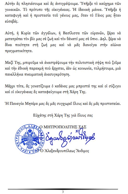 Αυτό ανέφερε μεταξύ άλλων ο Σεβασμιώτατος Μητροπολίτης Αλεξανδρουπόλεως κ. Άνθιμος στην Εγκύκλιό του για την εορτή Κοιμήσεως της Θεοτόκου. “Να ξαναγίνει η Παναγία πρότυπο για τις οικογένειες και για την κοινωνία μας”, υπογράμμισε και πρόσθεσε: “Μαζί Της, μπορούμε να αναστρέψουμε την πολιτιστική σήψη που ζούμε και την εθνική παρακμή που έρχεται, εάν ως κοινωνία, τολμήσουμε, μια πανελλήνια πνευματική ανασυγκρότηση. Μέχρι τότε, ας γονατίζουμε ο καθένας μας μπροστά της και οι σύζυγοι και οι οικογένειες ας καταφεύγουμε στη Χάρη Της. Η Παναγία Μητέρα μας ας μας συγχωρεί όλους και ας μας προστατεύει”.