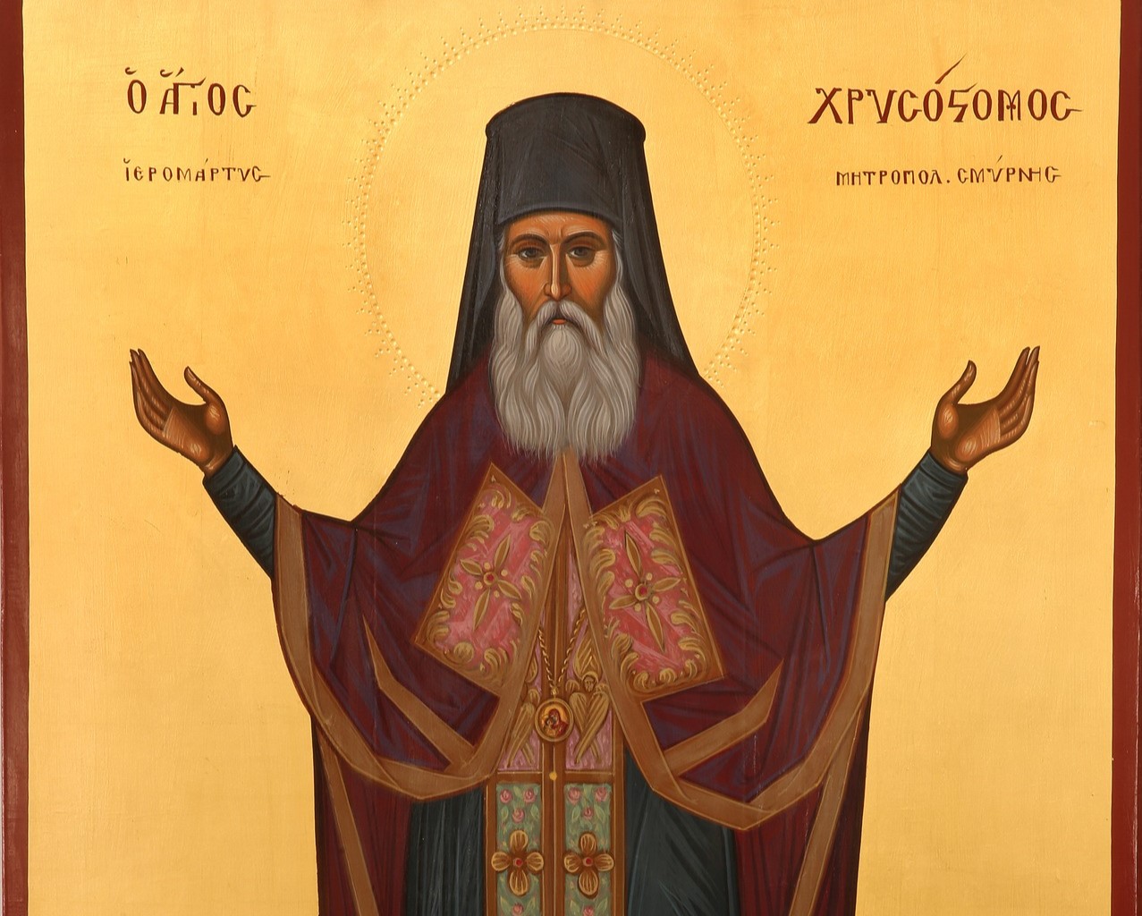 Πάντοτε το βλέμμα μου στεκόταν στη μορφή του Ιερομάρτυρα Χρυσοστόμου Σμύρνης. Η εικόνα του, αγιογραφημένη με τα ιδανικά και τις αξίες του Γένους μας. Φανέρωνε έναν ποιμένα που δεν εγκατέλειψε το ποίμνιό του, ακόμη κι όταν η φωτιά και η βία τύλιγαν τη Σμύρνη και απειλούσαν τη ζωή του.