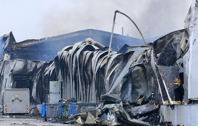 Πάντως, λόγω της φωτιάς ισοπεδώθηκε μέρος του κτιρίου, με αποτέλεσμα το εργοστάσιο στην κυριολεξία να κοπεί στα δύο, ενώ τα πάνελ στα πλάγια άνοιξαν στα «τριαντάφυλλα» και κατέρρευσε μεγάλο μέρος της οροφής.