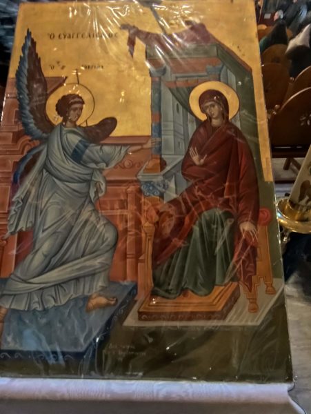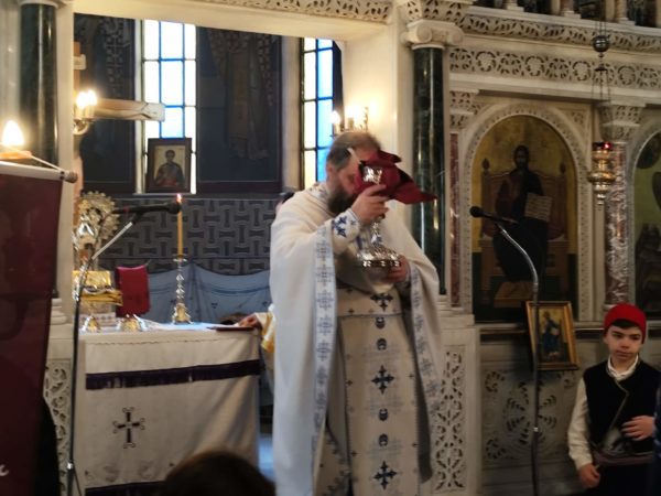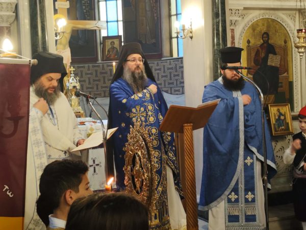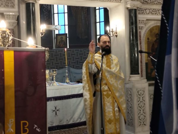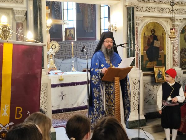 Με το πέρας της λειτουργίας ο ευλαβής Αρχιμανδρίτης κ.κ. Φιλούμενος απηύθυνε τον εωθινό λόγο για την ημέρα. Και μας συγκίνησε με τις εμπνευσμένες ιστορικές του αναφορές, στα μεγάλα ορόσημα του ΄21, την Αλαμάνα, τα Δερβενάκια, το Μανιάκι, την ηρωική έξοδο του Μεσολογγίου και τις άλλες μεγάλες στιγμές του, όπως και στα μελανά σημεία του, με τον αδελφοκτόνο εμφύλιο, που εξώθησε τον εθνικό μας ποιητή Διονύσιο Σολωμό, να γράψει στον 144-ο στίχο του «Ύμνου του εις την ελευθερία» :