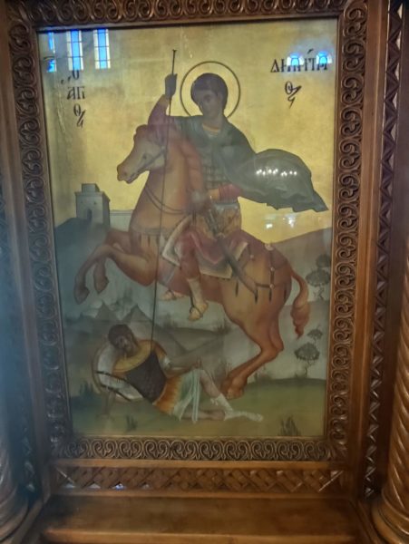 Της πανηγυρικής δοξολογίας χοροστάτησαν ο ευλαβής ιερατικός προϊστάμενος του Αγίου Δημητρίου Όπλων, Φιλούμενος Ρούμπης, συγχοροστατούντων των υπολοίπων ευσεβών ιερέων του ναού, πατέρων κ.κ. Μαμία Αγαθάγγελου, Σαλλάχ Παύλου, Γιατρά Πέτρου. Σημειώνοντας εδώ την έξοχη ηθική σύνδεση του Αγίου Δημητρίου των Όπλων, με το ιστορικό μας ορόσημο της 25-ης Μαρτίου. Δοθέντος ότι με την ευλογία του Αγίου Δημητρίου του Μυροβλήτη, την ιερή μέρα της 28-ης Οκτωβρίου, στην προγενέστερη της σημερινής εκκλησίας του Αγίου Δημητρίου στα Πατήσια, επι της οδού Στρατηγού Καλλάρη στις Τρείς Γέφυρες, ο οπλαρχηγός των Χασιωτών (της Χασιάς στην Αττική) Μελέτιος Βασιλείου – επονομαζόμενος «Χατζημελέτης», που είχε κοιμηθεί στο ναό – ξεκουράζοντας τα παλικάρια του, τα ζώα και φυλάσσοντας τον οπλισμό που είχε με ευφυή τρόπο αποσπάσει από τον Βοεβόδα των Αθηνών, για να αντιμετωπίσει τους Τουρκλαβανούς ληστές της Αττικής, ξεκίνησε βλέποντας στον ύπνο του σε όραμα τον Άγιο Δημήτριο να του λέει «Στα όπλα», στις 1 Απριλίου 1821 την επανάσταση στη Φυλή, για την απελευθέρωση των Αθηνών. Και εξ αυτού του γεγονότος η εκκλησία προσέλαβε τον χαρακτηρισμό «Άγιος Δημήτριος των Όπλων» ! Σηματοδοτώντας ο Άγιος Δημήτριος στην Αθήνα μας, το μεγάλο μας ιστορικό ορόσημο της εθνικής παλιγγενεσίας της 25-ης Μαρτίου.