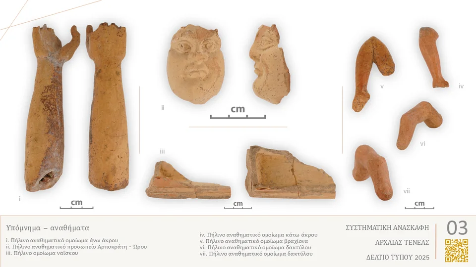 Το αναθηματικό ομοίωμα του Αρποκράτη μαζί με ευρήματα παλαιότερων ανασκαφικών περιόδων, όπως το χρυσό δαχτυλίδι με σφραγιδόλιθο, που απεικονίζει τον Απόλλωνα Ιατρό, το πήλινο ανάγλυφο πλακίδιο πετεινού, τα ακροκέραμα, το σιδερένιο δαχτυλίδι και ο λύχνος με αναπαραστάσεις του Σάραπη, αλλά και τα χρυσά φύλλα λωτού που συνδέονται με τον Αρποκράτη, και τέλος το πλήθος ζωοαρχαιολογικού υλικού από ζώα που χρησιμοποιήθηκαν σε μυστηριακές τελετές, ενισχύουν κατά πολύ την παραπάνω άποψη. Η παρουσία δε του Σάραπη και του Αρποκράτη αποδεικνύουν πως η Τενέα συμβαδίζει με τον πολιτιστικό και θρησκευτικό συγκρητισμό που προέκυψε από την Αίγυπτο και απέκτησε οικουμενικό χαρακτήρα στα χρόνια των Πτολεμαίων.