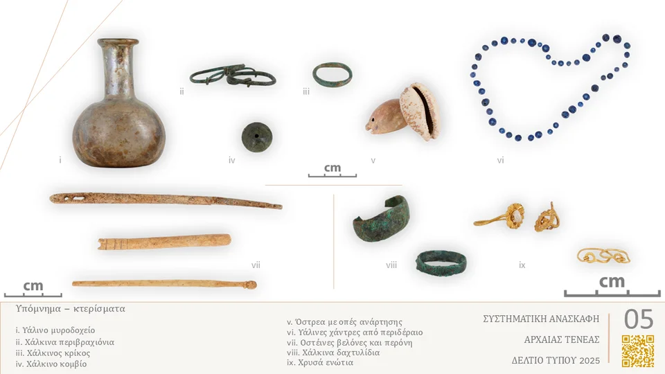 Ανασκάφηκαν συνολικά είκοσι τρεις (23) τάφοι, πλούσια κτερισμένοι με νομίσματα (Εικ.4), χρυσά και χάλκινα κοσμήματα (Εικ.5), υάλινες χάντρες (Εικ.5) και υάλινα μυροδοχεία (Εικ.5), πήλινα αγγεία (Εικ.6), λύχνους (Εικ.7) κ.ά.