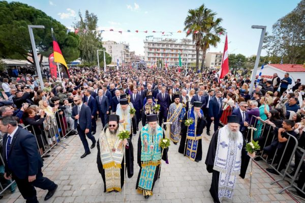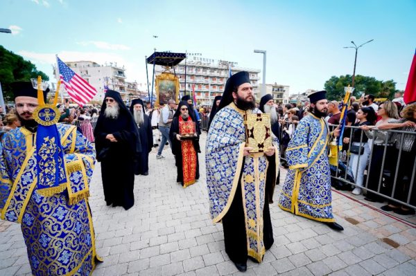 Με την ιερά λιτανεία μεταφέρθηκε η Εικόνα της Εξόδου, το Ιερό Λάβαρο και ο Σταυρός Ευλογίας του Επισκόπου Ρωγών Ιωσήφ στον Κήπο των Ηρώων της Ιεράς Πόλεως.