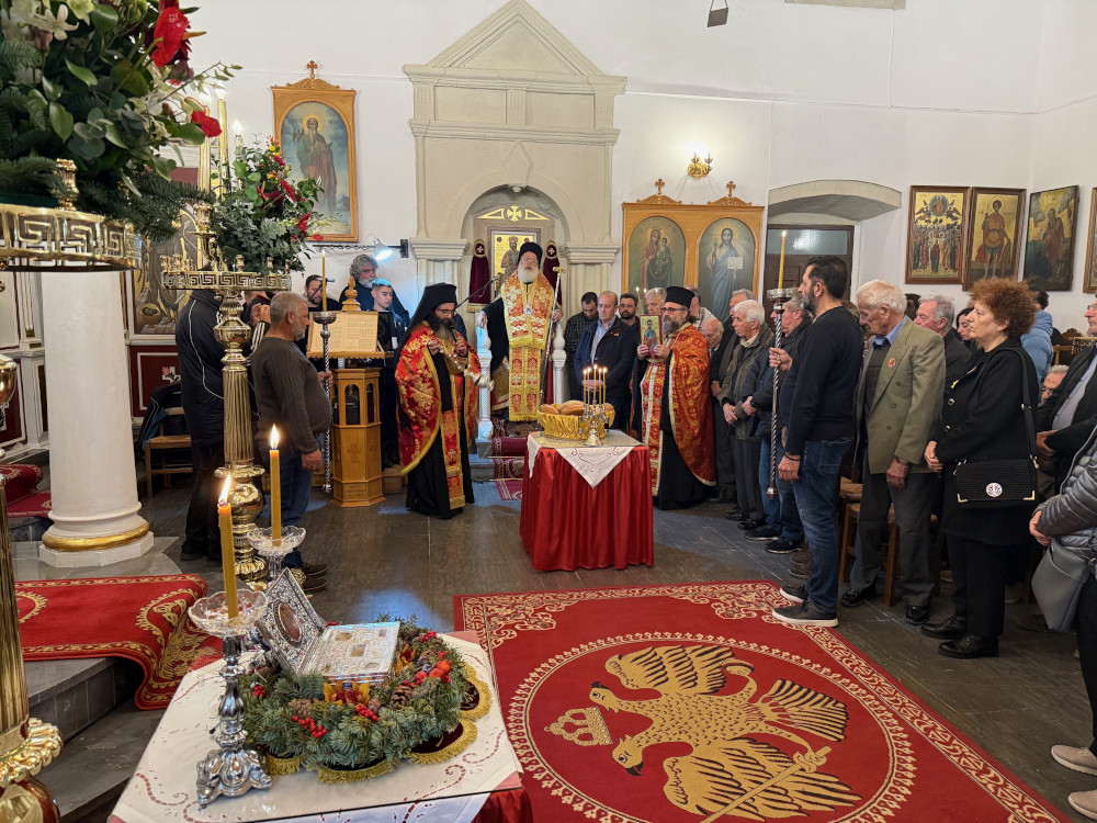 Ο Σεβασμιώτατος τόνισε ακόμα ότι είναι μεγάλη ευλογία η παρουσία αποτμήματος του ιερού λειψάνου του εορταζομένου αγίου, το οποίο φυλάσσεται στό Ι. Μ. Ναό του Αγίου Γεωργίου, που μαρτυρεί τη ζωντανή παρουσία των αγίων της Εκκλησίας, που αποτελούν ισχυρούς πρεσβευτές μας ενώπιον του θρόνου του Θεού.
