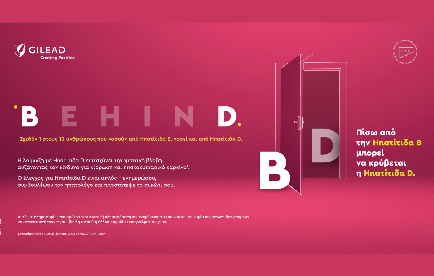 Πίσω από τη διάγνωση της Ηπατίτιδας Β μπορεί να κρύβεται η σοβαρότερη μορφή ιογενούς ηπατίτιδας: η Ηπατίτιδα D (HDV). Παρά τη βαρύτητά της, συχνά παραμένει αδιάγνωστη, καθώς εξελίσσεται σιωπηλά, επιβαρύνοντας σημαντικά την υγεία του ήπατος. Με στόχο να αναδείξει αυτή την «αόρατη» απειλή, η Gilead Sciences Ελλάδος, σε συνεργασία με την Ελληνική Εταιρεία Μελέτης Ήπατος (Ε.Ε.Μ.Η.), υλοποιεί την καμπάνια ενημέρωσης BehinD – Πίσω από την Ηπατίτιδα Β μπορεί να κρύβεται η Ηπατίτιδα D.