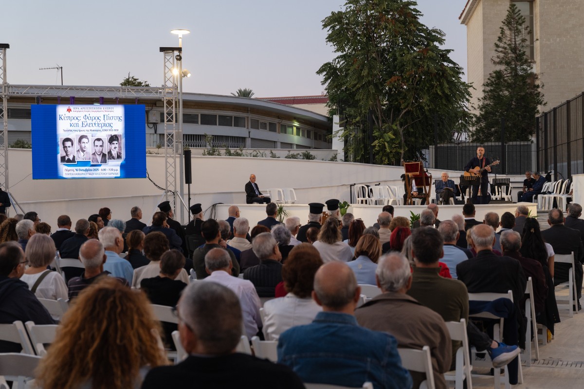 Την εκδήλωση τίμησε με την παρουσία του ο εκπρόσωπος της Α.Ε. του Προέδρου της Κυπριακής Δημοκρατίας, δρ. Νικόλας Ιωαννίδης, Υφυπουργός Μετανάστευσης και Διεθνούς Προστασίας. Χαιρετισμό απηύθυναν και ο εκπρόσωπος του Προέδρου της Κυπριακής Δημοκρατίας. Ακολούθως, μίλησε ο Δρ. Νίκος Ορφανίδης, ο οποίος μέσα από μια εμπνευσμένη ομιλία αναφέρθηκε στη θυσία και το ήθος των αγωνιστών της ΕΟΚΑ, αναδεικνύοντας το παράδειγμά τους ως «αιώνιο φάρο πίστης, ελπίδας και αντίστασης». Το καλωσόρισμα εκ μέρους του Γραφείου Ενημερώσεως και Επικοινωνίας της Εκκλησίας της Κύπρου έκανε ο κ. Παναγιώτης Καπαρής, δημοσιογράφος από τη Λύση. Στη συνέχεια, τρεις Εκκλησιαστικοί Επίτροποι και αγωνιστές του 1955–1959 (Ελένη Χριστοφορίου, Ανδρέας Μεϊμαρίδης και Ανδρέας Τοφιάς) μοιράστηκαν ζωντανές μαρτυρίες, συγκινώντας βαθιά το κοινό.