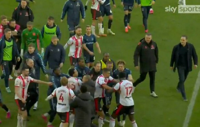 Αμέσως έτρεξαν προς εκεί και αυτοί της Κόβεντρι για να υπερασπιστούν τον προπονητή τους και τελικά υπήρξε γενική σύρραξη, με τους ψυχραιμότερους να μπαίνουν στη μέση και να δίνουν… μάχη για να επανέλθει η ηρεμία.