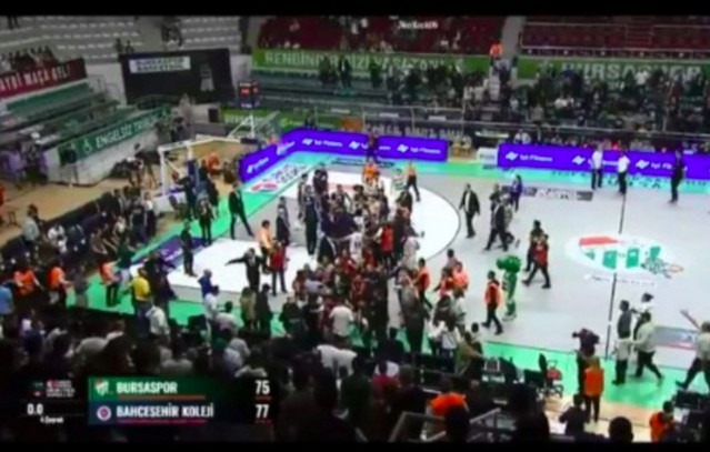 Απίθανο σκηνικό στην Τουρκία, όπου οπαδοί της Μπούρσασπορ έκαναν… ντου στο παρκέ στον αγώνα μπάσκετ με τη Μπαχτσεσεχίρ για να πάρουν στο κυνήγι τον Φλιν που τους πέταξε τη μπάλα.