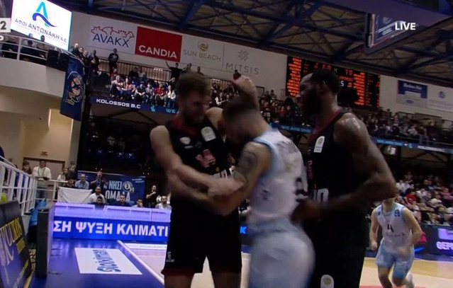 Αυτή η ένταση πέρασε και στο παρκέ και έγινε ακόμη μεγαλύτερη όταν οι Βεζένκοβ και Πετρόπουλος πιάστηκαν στα χέρια, με τον παίκτη του Κολοσσού να σπρώχνει τον σταρ του Ολυμπιακού, ο οποίος προσπάθησε να απαντήσει με γροθιά.