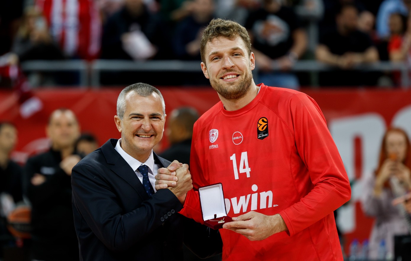Ο Σάσα Βεζένκοβ βραβεύτηκε από τον υπουργό Αθλητισμού της Βουλγαρίας, Ντίμιταρ Ιλίεβ, λίγο πριν την έναρξη της αναμέτρησης του Ολυμπιακού με τη Χάποελ Τελ Αβίβ για την 37η αγωνιστική της Euroleague.