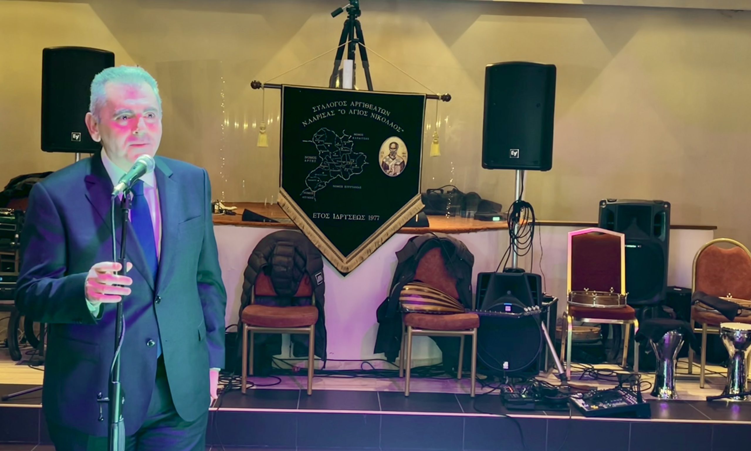 Ο Θεσσαλός πολιτικός στον χαιρετισμό του συνεχάρη τον πρόεδρο κ. Κωνσταντίνο Σιατραβάνη «γιατί είστε από τους δραστήριους συλλόγους στην Λάρισα. Αγαπητέ Δήμαρχε Λαρισαίων (Θανάση Μαμάκο) η Λάρισα είναι μια μεγαλούπολη τόσο όσο να γνωριζόμαστε, να διατηρούμε ανθρώπινες σχέσεις, να μη χανόμαστε μέσα στη συνάφεια του κόσμου. Και είναι σημαντικό ότι μια μεγαλούπολη όπως η Λάρισα που φιλοξενεί ανθρώπους απ’ όλη τη Θεσσαλία, αλλά και απ’ όλη την Ελλάδα, δεν τους αλλοτριώνει, αλλά τους δίνει τη δυνατότητα να διατηρούν τις ιδιαίτερες παραδόσεις, τα ήθη και τα έθιμα από τη γενέτειρά τους.