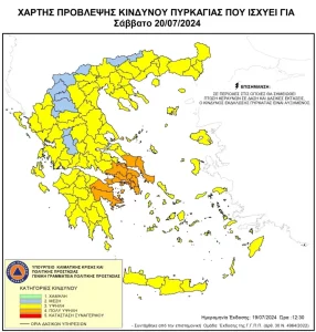 Αντιμέτωπες με πολύ υψηλό κίνδυνο φωτιάς βρίσκονται σήμερα, Σάββατο (20/7) 5 περιοχές της χώρας, σε Αττική, Βοιωτία, Εύβοια και ανατολική Πελοπόννησο, σύμφωνα με το χάρτη πρόβλεψης κινδύνου πυρκαγιάς που εκδίδει η Γενική Γραμματεία Πολιτικής Προστασίας.