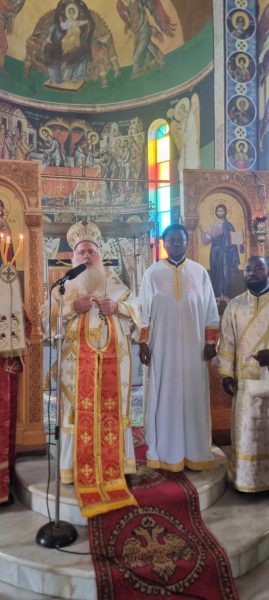 Επίσης ο Σεβασμιώτατος Μητροπολίτης Κινσάσας κ. Θεοδόσιος ανέφερε λόγους Αγίων Πατέρων για το αξίωμα της Ιεροσύνης και κάλεσε τον νέον ιερέα καθημερινά να μελετά τα κείμενα των Αγίων, να αγωνίζεται πνευματικά και να εφαρμόζει στην ζωή του το θέλημα του Θεού. Στο τέλος της Θείας Λειτουργίας προχείρησε τον νέο Πρεσβύτερο Αρχιμανδρίτη λόγο της κατοχής του πτυχίου της Θεολογικής Σχολής αλλά και της υπακοής που δείχνει κάθε φορά στην Εκκλησία και στον επίσκοπο του.