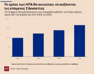 Οι ΗΠΑ δεν είναι πολύ πίσω. Το Γραφείο Προϋπολογισμού του Κογκρέσου υπολογίζει ότι το δημόσιο χρέος θα αυξηθεί από 97% σε 122% της παραγωγής έως το 2034 – περισσότερο από το διπλάσιο του μέσου όρου από το 1994.