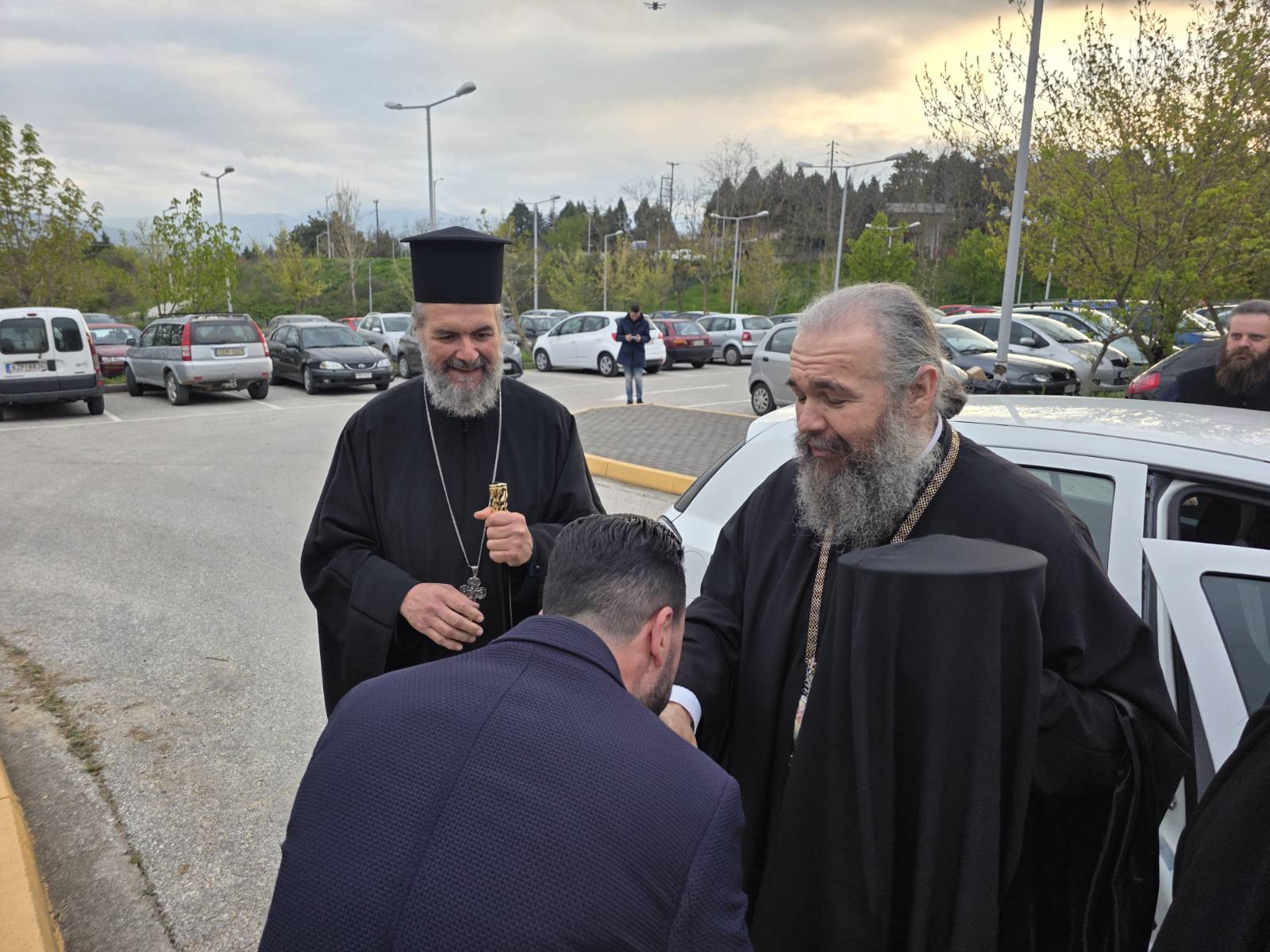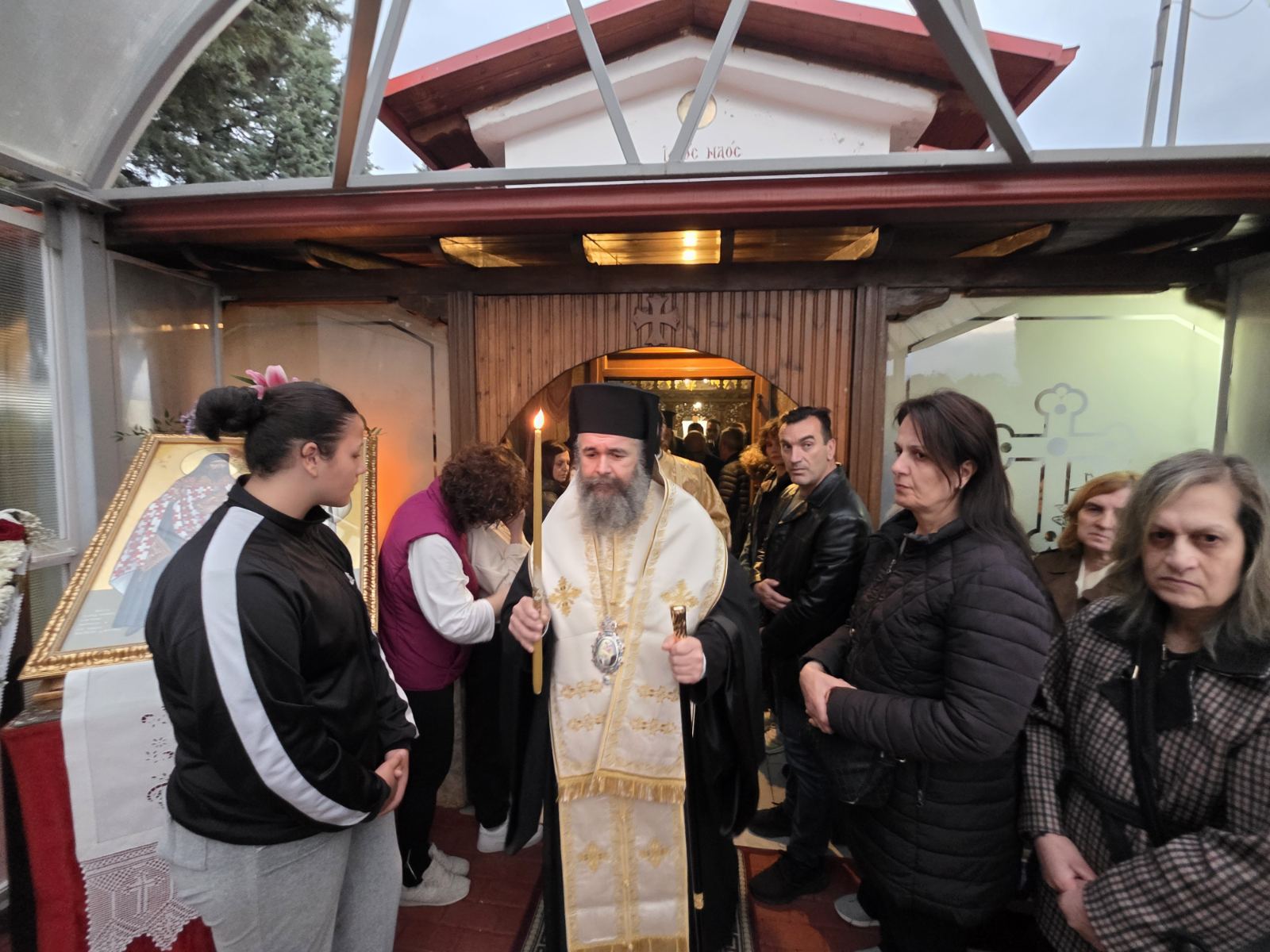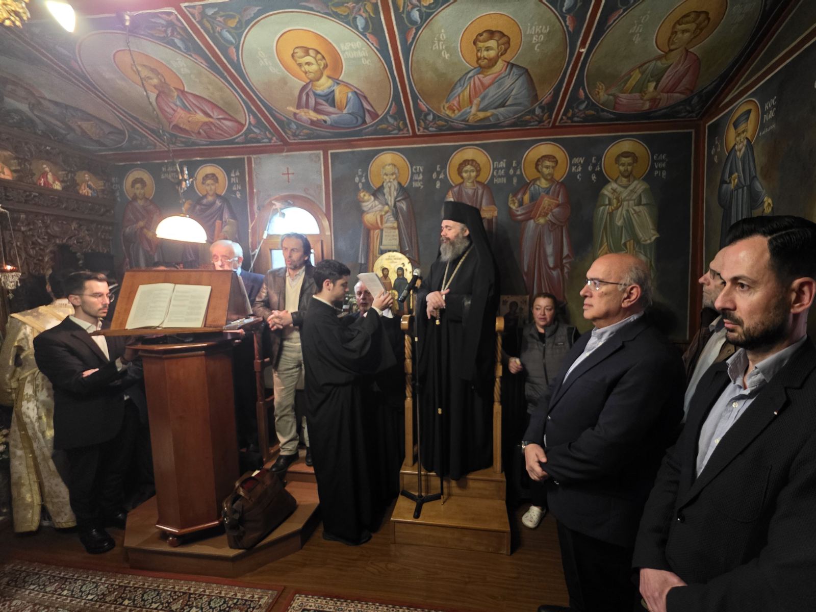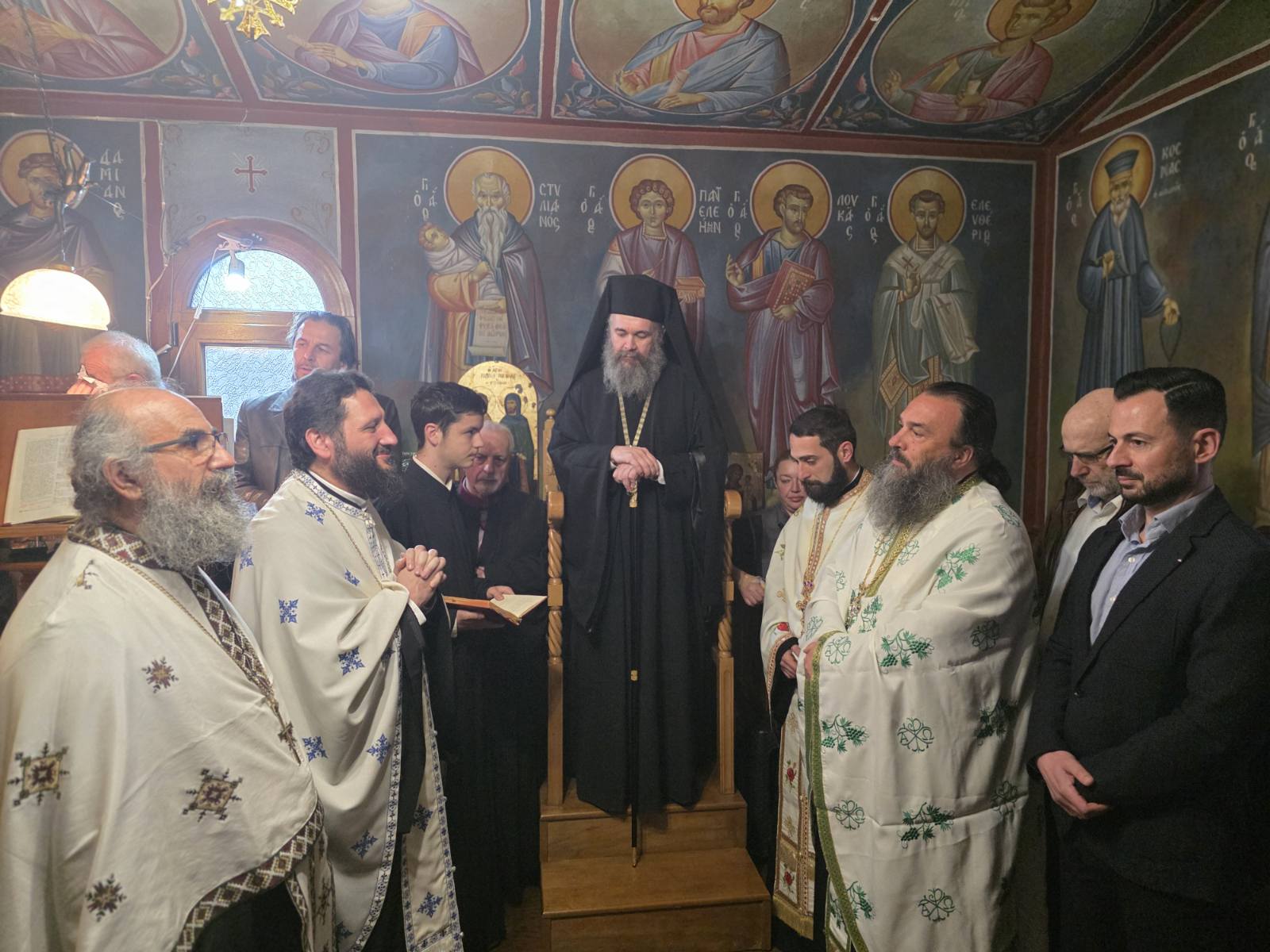 Εκεί χοροστάτησε στον πανηγυρικό Εσπερινό, παρουσία των τοπικών αρχών, του διοικητού του Νοσοκομείου και πολλών πιστών, οι οποίοι προσήλθαν με ευλάβεια για να τιμήσουν τη χάρη των Αγίων.