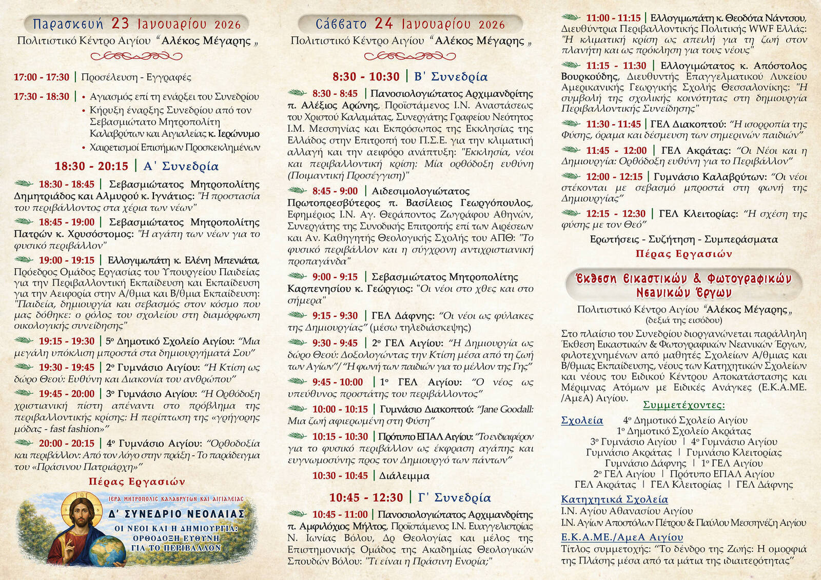 Η Ιερά Μητρόπολη Καλαβρύτων και Αιγιαλείας, στο πλαίσιο της αδιάλειπτης μέριμνάς Της υπέρ της νεολαίας και της σχέσεως Αυτής με τις αξίες της Ορθόδοξης παράδοσης, διοργανώνει το Δ΄ Συνέδριο Νεολαίας, με θέμα: «Οι Νέοι και η Δημιουργία: Ορθόδοξη Ευθύνη για το Περιβάλλον», το οποίο τελεί υπό την αιγίδα του Σεβασμιωτάτου Μητροπολίτου Καλαβρύτων και Αιγιαλείας κ. Ιερωνύμου και συνδιοργανώνεται με τον Δήμο Αιγιαλείας, με τη συνδρομή της Περιφέρειας Δυτικής Ελλάδος.