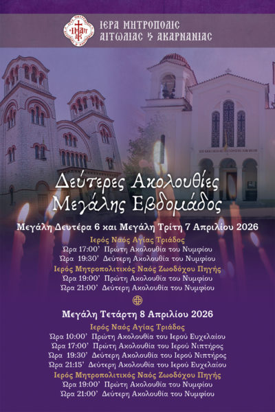 Η Ιερά Μητρόπολη Αιτωλίας και Ακαρνανίας θέλοντας να προσφέρει την δυνατότητα σε εργαζομένους, νέους και μαθητές να συμμετέχουν στις Ιερές Ακολουθίες του Νυμφίου το απόγευμα της Μεγάλης Δευτέρας και της Μεγάλης Τρίτης, καθώς και στην Ιερά Ακολουθία του Νιπτήρος το απόγευμα της Μεγάλης Τετάρτης έχει καθιερώσει την τέλεση δεύτερης Ακολουθίας στο Αγρίνιο, στον Ιερό Μητροπολιτικό Ναό Ζωοδόχου Πηγής, στις 9:00 το βράδυ. Η πρώτη ακολουθία στον Ιερό Μητροπολιτικό Ναό θα αρχίζει στις 7:00 το απόγευμα.