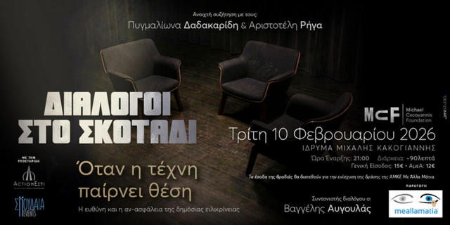 Ο πρώτος Διάλογος στο Σκοτάδι φιλοξενείται στο Ίδρυμα Μιχάλης Κακογιάννης, την Τρίτη 10 Φεβρουαρίου 2026, με θέμα: «Όταν η τέχνη παίρνει θέση: Η ευθύνη και η αν-ασφάλεια της δημόσιας ειλικρίνειας» και θα διεξαχθεί, όπως μεταδίδει το ticketservices.gr στις 21:00.