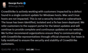 Ο διευθύνων σύμβουλος της Crowdstrike, George Kurtz, ανέφερε σε δήλωσή του: