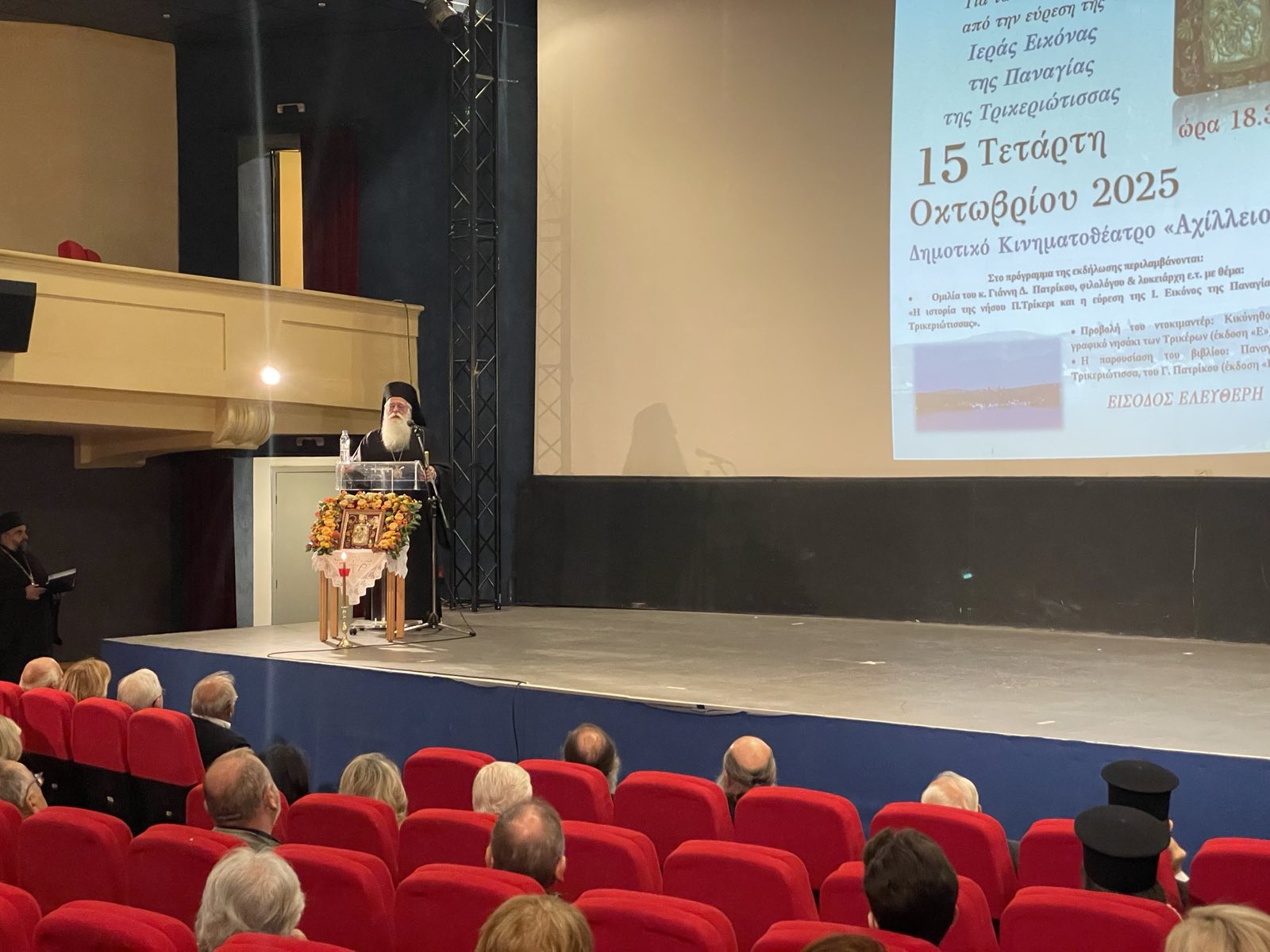 Επετειακή εκδήλωση αφιερωμένη στα 200 χρόνια (1825–2025) από τη θαυματουργική εύρεση της Ιεράς Εικόνας της Παναγίας της Φανερούσας ή Φανερωμένης ή Τρικεριώτισσας πραγματοποιήθηκε χθες στο Κινηματοθέατρο «Αχίλλειον» από τον Σύλλογο Συμπαραστάσεως Κρατουμένων «Ο Εσταυρωμένος» σε συνεργασία με τον φορέα πολιτισμού της Ιεράς Μητροπόλεως Δημητριάδος «Μαγνήτων Κιβωτός» για τη διάσωση του πολιτιστικού αποθέματος.