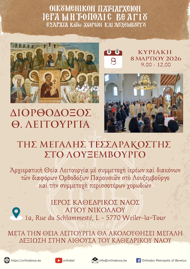 Την Κυριακή 8 Μαρτίου 2026, θα τελεσθεί στον Καθεδρικό Ναό Αγίου Νικολάου Λουξεμβούργου, Rue du Schlammestée 1Α, L-5770 Weiler-la-Tour, ΔΙΟΡΘΟΔΟΞΟΣ ΘΕΙΑ ΛΕΙΤΟΥΡΓΙΑ, με την συμμετοχή ιερέων και διακόνων των διαφόρων Ορθοδόξων Παρουσιών στο Λουξεμβούργο και περισσοτέρων χορωδιών.