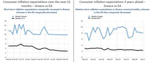 Εντελώς διαφορετική είναι η εικόνα που διαμορφώνεται κατά μέσον όρο στην ευρωζώνη, καθώς οι καταναλωτές βλέπουν τον πληθωρισμό στο 2,7% σε 12μηνη βάση, από 2,8% στην προηγούμενη έρευνα της ΕΚΤ. Σε μεσοπρόθεσμο ορίζοντα (τριετίας) τα ελληνικά νοικοκυριά προβλέπουν επίσης πολύ υψηλό πληθωρισμό, 8,1%, έναντι μόλις 2,3% για τα νοικοκυριά της ευρωζώνης.