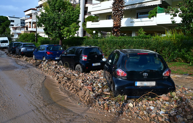Δύο ημέρες μετά τον κατακλυσμό, αρχίζει να εξομαλύνεται η εικόνα στις οδούς Μετσόβου και Ανθέων, στην Άνω Γλυφάδα. Πρόκειται για τον μεγάλο δρόμο της Τερψιθέας που είχε κλείσει από πέτρες και φερτά υλικά.