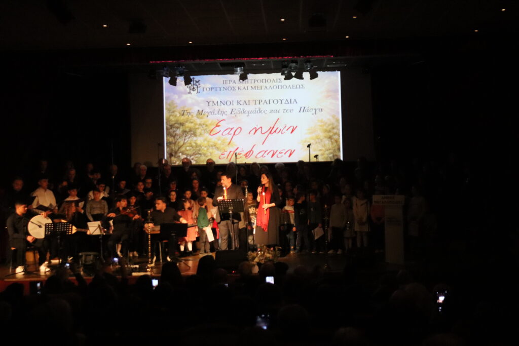 Με ιδιαίτερη επιτυχία και σε κατανυκτική ατμόσφαιρα πραγματοποιήθηκε την Τετάρτη 1 Απριλίου, στο Πνευματικό Κέντρο του Δήμου Μεγαλοπόλεως «Ο Πολύβιος», η εκδήλωση της Ιεράς Μητροπόλεως Γόρτυνος και Μεγαλοπόλεως με τίτλο: «Έαρ ημίν επέφανεν», αφιερωμένη στους ύμνους και τα τραγούδια της Αγίας και Μεγάλης Εβδομάδος και του Πάσχα.