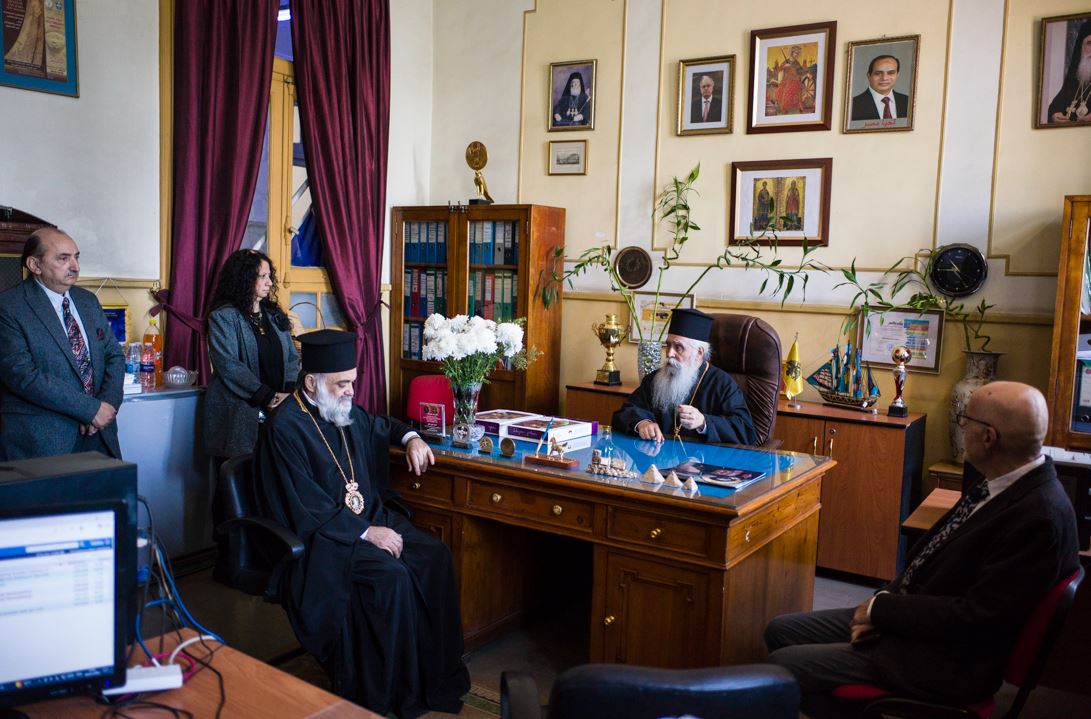 Στη συνέχεια, οι δύο Αρχιερείς κατευθύνθηκαν στην Αμπέτειο Σχολή, όπου τους υποδέχτηκαν με χαρά, στο θέατρο της Σχολής, οι μαθητές του Γυμνασίου και του Λυκείου, τα μέλη της εκπαιδευτικής κοινότητας και το Συμβούλιο του Ιδρύματος Αμπέτ. Τη Βασιλόπιτα ευλόγησε ο Σεβασμιώτατος Αρχιεπίσκοπος Σινά Συμεών, ο οποίος ήταν και ο τυχερός της ημέρας, κερδίζοντας συγκινημένος το φλουρί για το καλό της νέας χρονιάς.