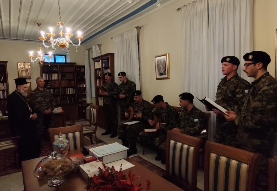 Οι στρατιώτες αντάλλαξαν ευχές με τον Σεβασμιώτατο και του έψαλαν τα παραδοσιακά χριστουγεννιάτικα κάλαντα, μεταφέροντας το εορταστικό κλίμα και το μήνυμα της χαράς και της ελπίδας που συνοδεύει τη Γέννηση του Χριστού.