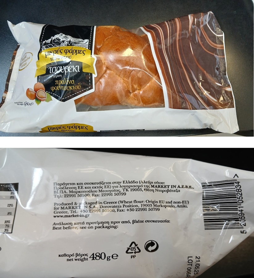 Ο Ε.Φ.Ε.Τ. και ειδικότερα η Περιφερειακή Διεύθυνση Δυτικής Ελλάδας, στο πλαίσιο του Προγράμματος «Επίσημος Έλεγχος για την Παρακολούθηση των Επιπέδων Προσθέτων Τροφίμων και Αρωματικών Ουσιών σε Τρόφιμα», προέβη σε δειγματοληψία τροφίμου με τα στοιχεία: «Τσουρέκι με γέμιση πραλίνα φουντουκιού – μικρές φάρμες του βουνού» με ημερομηνία ανάλωσης κατά προτίμηση πριν από τις 21/05/25 και αριθμό παρτίδας Lot 066A1, συσκευασίας καθαρού βάρους 480g, το οποίο παράγεται και συσκευάζεται στην Ελλάδα για λογαριασμό της ΜΑΡΚΕΤ ΙΝ Α.Ε.Β.Ε. που εδρεύει στην ΒΙ.ΠΑ. Μαρκοπούλου Μεσογαίας.
