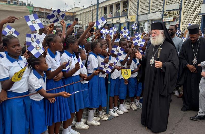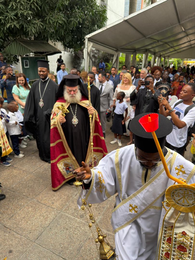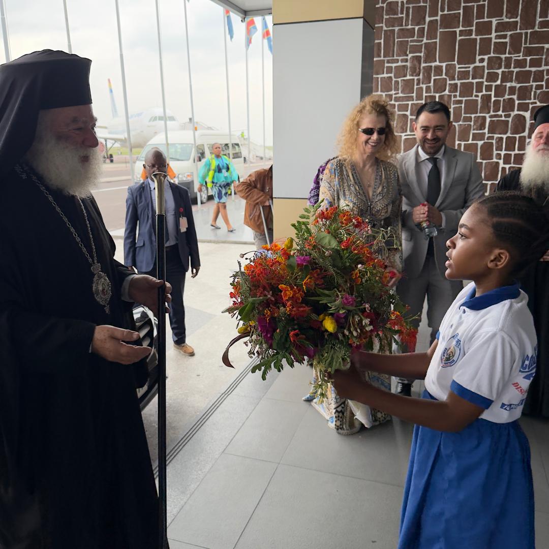 Στην έξοδο του αεροδρομίου μαθητές του παραπλεύρως ευρισκομένου ορθοδόξου σχολείου καθώς και πιστοί με τους ιερείς επεφύλαξαν θερμή υποδοχή στον Μακαριώτατο. Ο Μακαριώτατος με μεγάλη συγκίνηση ευλόγησε και αγκάλιασε τα παιδιά, τα οποία ασταμάτητα τραγουδούσαν και καλωσόριζαν τον πνευματικό τους πατέρα. Στην συνέχεια ο Μακαριώτατος αφίχθη στον Μητροπολιτικό Ναό του Αγίου Νικολάου της Ελληνικής Κοινότητας Κινσάσας. Εκεί τον υποδέχθηκαν ο Μητροπολίτης Κανάγκας κ. Χαρίτων και οι Επίσκοποι Κωνσταντιανής κ. Κοσμάς και Ιππώνος κ. Στέφανος. Επίσης οι Έλληνες της Ελληνικής Κοινότητας Κινσάσας αλλά και πολλοί πιστοί της Ιεράς Μητροπόλεως. Στον Ιερό Ναό εψάλη Δοξολογία ενώ μετά το πέρας της ο οικείος Μητροπολίτης κ. Θεοδόσιος προσφωνώντας τον Προκαθήμενο της Αφρικής μεταξύ των άλλων ανέφερε: «Χαιρόμεθα καὶ συγκινούμεθα, διότι σας έχωμεν και πάλιν κοντά μας και δοξάζομε τον Θεόν, διότι μας διδάσκετε εμπράκτως, δίδοντας το παράδειγμα του Καλού Ποιμένος, ο οποίος νύκτα και ημέρα αγρυπνεί κινούμενος αδιακόπως, διὰ νὰ ενισχύει και προωθεί το έργον της Ιεραποστολής καθ’ όλην την αφρικανικὴ ήπειρο. Σας συνέχει ο λόγος του Αποστόλου Παύλου «ἡ μέριμνα πασῶν τῶν ἐκκλησιῶν», δηλαδή η αγωνιώδης φροντίδα καὶ «ὁ φόρτος τῶν σκέψεων τοσούτων ἐκκλησιῶν κατατήκει ὑμᾶς», όπως λέγει ο Ιερός Θεοφύλακτος. Ο ασίγαστος πόθος σας είναι το Σώμα του Χριστού να επεκτείνεται όλο και περισσότερον και όλο και περισσότεροι πιστοί να αγωνίζονται για την κάθαρση, τον φωτισμό και την θέωση.