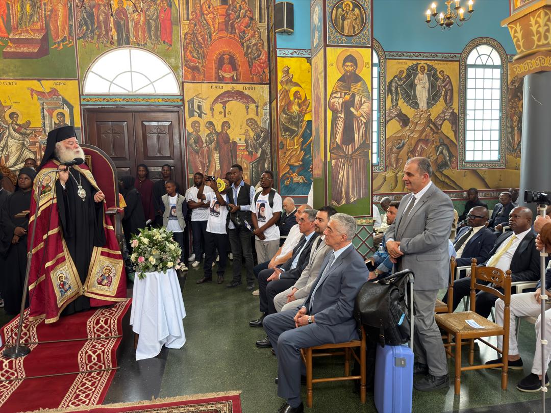 Στο αεροδρόμιο της Κινσάσας τον υποδέχθηκαν ο Εξοχότατος Πρόξενος της Ελλάδος στο Κονγκό κ. Δαβίδ Μαρίνης, ο εκπρόσωπος της χώρας, ο οικείος Μητροπολίτης κ. Θεοδόσιος, ο Επίσκοπος Μπενί κ. Αθανάσιος και ο Πρόεδρος της Ελληνικής Κοινότητας Κινσάσας αξιότιμος κ. Γεράσιμος Ντούνης μετά της συζύγου του.