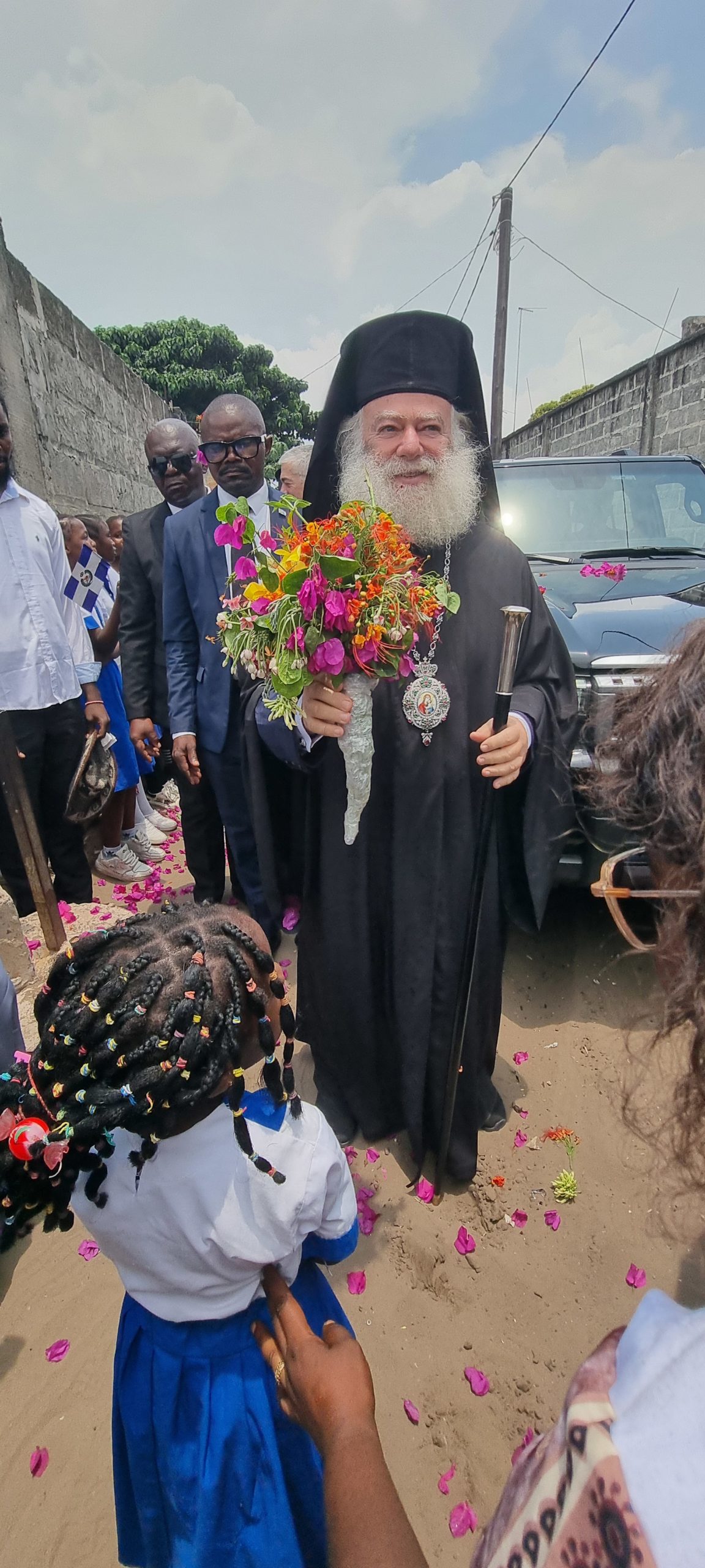 Τον Μακαριώτατο συνόδευσαν στις σημερινές ποιμαντικές επισκέψεις του ο οικείος Ιεράρχης Κινσάσας κ. Θεοδόσιος, ο Επίσκοπος Μπενί κ. Αθανάσιος, ο Επίσκοπος Κωνσταντιανής κ. Κοσμάς, ο π. Παύλος από την Ουγκάντα, ο Γενικός Πρόξενος της Ελλάδος στο Κονγκό και Πρόεδρος της Ελληνικής Κοινότητας Κινσάσας κ Γεράσιμος Ντούνης μετά της συζύγου του ιατρού κυρίας Παρασκευής Τριανταφύλλου-Ντούνη και οι συνοδοί του από την Ελλάδα κ. Χαράλαμπος Μεταλλίδης Πρόεδρος της Αδελφότητας Εξωτερικής Ιεραποστολής Θεσσαλονίκης και ο κ. Νικόλαος Ασλανίδης ανταποκριτής της ΕΡΤ 3.