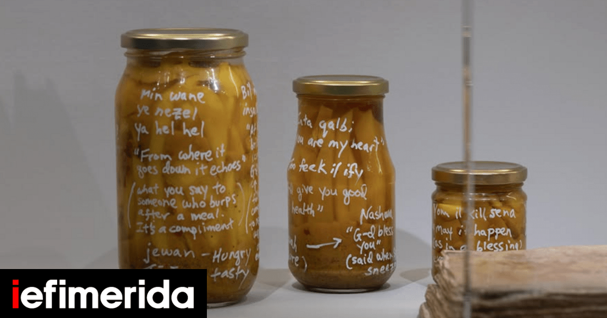 Στην τελευταία αίθουσα, τα ράφια λάμπουν σαν κεχριμπάρι: Βάζα με άμπα-τουρσί μάνγκο- φτιαγμένα εδώ. Πάνω στο γυαλί χαραγμένες λέξεις της ιρακινοεβραϊκής οικογενειακής γλώσσας. Αλλά και αγγλικές αναφορές -σου φιλώ τα χέρια, διαβάζω σε έναλ Το δωμάτιο διαβάζεται σαν μαγείρεμα: σιγά-σιγά, με υπομονή. Ψάχνω την συνταγή σε μια από τις κολώνες, μαζί καταγράφω και άλλες που θα δοκιμαστούν στην δική μου στόφα. Τα βάζα με το άμπα συνομιλούν με το μνημειακό Chicago Assyrian Dictionary. Δύο λεξικά: το ένα τρώγεται, το άλλο διαβάζεται. Και τα δύο απαντούν στην ίδια ερώτηση: τι κρατάμε, τι αφήνουμε, πώς ενώνουμε ένα σώμα που έχει σπάσει.