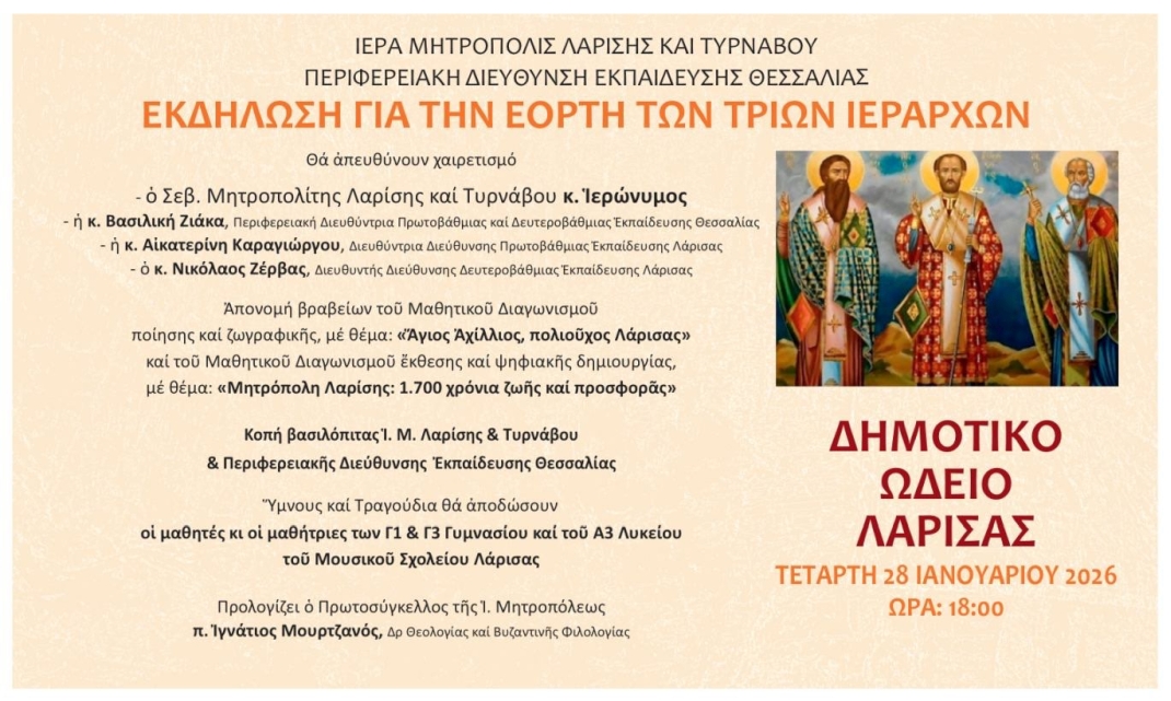Η Ιερά Μητρόπολη Λαρίσης και Τυρνάβου, με την ευκαιρία της εορτής των Τριών Ιεραρχών, πατέρων και διδασκάλων της Εκκλησίας και προστατών της Ελληνορθοδόξου Παιδείας και Παράδοσης, διοργανώνει εκδήλωση, στο Δημοτικό Ωδείο Λάρισας, την Τετάρτη 28 Ιανουαρίου 2026 και ώρα 6:00 μ.μ., προκειμένου: